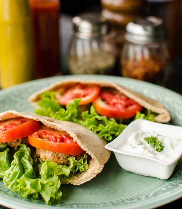 Whole-wheat pita bread filled with crunchy lettuce, tomatoes, nutritious falafels made with cottage cheese and bulghur wheat, all in a traditional tzatziki dressing.